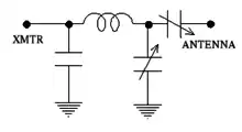 This configuration is currently popular because it is capable of matching a large impedance range with capacitors in commonly available sizes. However, it is a high-pass filter and will not attenuate spurious radiation above the cutoff frequency nearly as well as other designs (see the π-network section, below). Due to its low losses and simplicity, many home-built and commercial manually tuned ATUs use this circuit. The tuning coil is normally also adjustable (not shown).