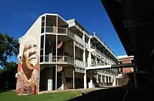 However, it's unclear whether the building has retained the name of Thozet Building after the installation of two murals on the eastern side of the building in 2017.[24] Artists Bill Gannon, Luke Gannon and Jon Watson created murals of Aunty Ollie (a custodian of the Darumbal people) and Malcolm Mann (a Darumbal traditional owner) which were officially unveiled in September 2017.[25] The "Thozet Building" signage was removed from the exterior of the building prior to the murals being painted and it has since been simply referred to as "Building 7" in the university's own online articles. In a 2019 online article, the university stated that the structure is "now known as building 7".[23]