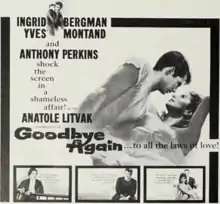 After buying himself out of his Paramount contract, Perkins moved to France and began making European films, the first of which was Goodbye Again (1961) with Ingrid Bergman, which was shot in Paris. It centered around a May-December romance. Paula Tessier (Bergman) tries to resist the charms of Philip Van der Besh (Perkins), who is the son of one of her clients, while stuck in an unfulfilling affair with a cheating businessman (Yves Montand). It was originally entitled Time on Her Hands, although Perkins suggested the English title Goodbye Again after one of his father's plays.[90] Once again, Perkins found himself subjected to the romantic attention of his female costar, although he customarily declined.[5] Despite any off-screen tension this might have caused, Perkins's role in the film was greatly praised and earned him the Cannes Film Festival Award for Best Actor.[90]