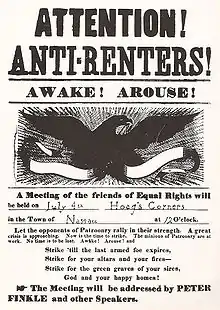 The incident began with death the of Stephen Van Rensselaer III in 1839.[1] Van Rensselaer, who was described as a lenient and benevolent landowner" was the patroon of the region at the time.[2] As a way to develop his vast landholdings, Van Rensselaer granted tenants lifetime leases at moderate prices.[3] During his life, when tenants were in financial constraints, he preferred to accept rent in the form of goods and services in lieu of cash, allow rents to accumulate, or accept partial payment rather than evict them.[3] However, his leases also included a "quarter-sale" provision, which required tenants who sold their leases to pay Van Rensselaer one fourth of the sale price or one additional year's rent.[3] The patroons owned all the land on which the tenants in the Hudson Valley lived, and used this feudal lease system to maintain control of the region.[3] When he died, his wealth had been reduced in the economic downturn known as the Panic of 1837,[4] so Van Rensselaer's will directed his heirs to collect outstanding rents and "quarter sale" payments to apply to his estate's debts.[4] When the heirs attempted to collect, tenants who believed their debts would be forgiven at Van Renselaer's death could not pay the amounts demanded, could not secure a favorable payment schedule from the heirs, and could not obtain relief in the courts, so they revolted.[3][4]