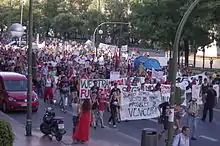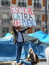 The anti-austerity movement in Spain, also referred to as the 15-M Movement (Spanish: Movimiento 15-M),[2] and the Indignados Movement,[3] was a series of protests, demonstrations, and occupations against austerity policies in Spain that began around the local and regional elections of 2011 and 2012.[4][3] First starting on 15 May 2011, many of the subsequent demonstrations spread through various social networks such as Real Democracy NOW (Spanish: Democracia Real YA) and Youth Without a Future (Spanish: Juventud Sin Futuro).[5]