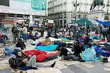 Protests and nighttime camp-outs took place in 30 cities around Spain, including Barcelona and Valencia.[53] The protests gained the support of some people in the United Kingdom, who announced that they would sit outside of the Spanish embassy from 18 to 22 May.[53] The protest in Plaza del Sol on the night of 17 May consisted of about 4,000 people, according to the authorities. As evening fell, the protesters put up a large tarp canopy beneath which they passed out signs with the intention of spending the night.[54] Three hundred of them stayed until the dawn of 18 May.[52] The camp can be considered a form of prefigurative politics and can be understood as a small symbolic city within the city.[14]
