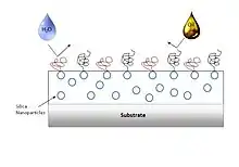 One of the newer additions to this ever growing market are nanoparticle based coatings. Silica particles are formed using the sol-gel method. The resulting silica particles have both reactive (Si-OH) and nonreactive (Si=O) groups on the surface. The reactive groups provide locations for further chemical processing, which allow you to change the surface properties of the nanoparticles. For anti-graffiti coatings, hydrophobic and oleophobic (oil-fearing) ligands are grafted onto the silica nanoparticles. Hydrophobic ligands are non-polar molecules such as hydrocarbon chains. Oleophobic ligands consist of polar molecules. Normally these two different types of molecules would phase separate in solution, for the same reason that water and oil do not mix. By chemically grafting the ligands onto the silica particles, this effect is counteracted. The effect is a coating that shows an equal dislike for both water-based and oil-based paints.[4]