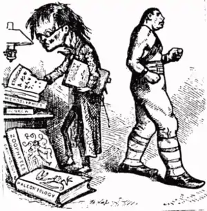 In U.S. history, the advocacy and acceptability of anti-intellectualism varied, because in the 19th century most people lived a rural life of manual labor and agricultural work, therefore, an academic education in the Greco–Roman classics, was perceived as of impractical value; the bookish man is unprofitable. Yet, in general, Americans were a literate people who read Shakespeare for intellectual pleasure and the Christian Bible for emotional succor; thus, the ideal American Man was a literate and technically-skilled man who was successful in his trade, ergo a productive member of society.[20] Culturally, the ideal American was the self-made man whose knowledge derived from life-experience, not an intellectual man whose knowledge of the real world derived from books, formal education, and academic study; thus, the justified anti-intellectualism reported in The New Purchase, or Seven and a Half Years in the Far West (1843), the Rev. Bayard R. Hall, A.M., said about frontier Indiana:[18]