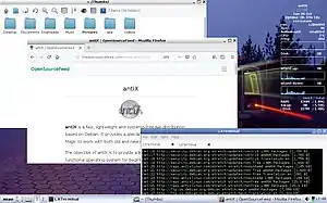antiX is a Linux distribution, originally based on MEPIS, which itself is based on the Debian stable distribution. It initially replaced the MEPIS KDE desktop environment with the Fluxbox and IceWM window managers, making it suitable for older, less powerful x86-based systems. Unlike Debian, antiX does not use systemd[10] The releases of antiX are named after prominent left-wing figures, groups and revolutionaries.