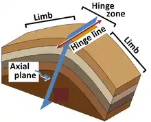 The hinge of an anticline refers to the location where the curvature is greatest, also called the crest.[1] The hinge is also the highest point on a stratum along the top of the fold. The culmination also refers to the highest point along any geologic structure. The limbs are the sides of the fold that display less curvature. The inflection point is the area on the limbs where the curvature changes direction.[2]