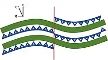 The magnesian serpentines (antigorite, lizardite, chrysotile) are trioctahedral hydrous phyllosilictes. Their structure is based on 1:1 octahedral-tetrahedral layer structures. Antigorite is monoclinic in the space group Pm.[13] Although the magensian serpentines have similar compositions, they have significantly different crystallographic structures, which are dependent on how the SiO4 tetrahedra sheets fit in with the octahedral sheets.[14] Antigorite's basic composition has a smaller ratio of octahedral to tetrahedral cations (relative to lizardite and chrysotile),[15] allowing the structure to compensate for the misfit of sheets through periodic flipping of the curved tetrahedra layers, and subsequently their polarity.[16] Polysomes of antigorite are defined by the number of individual tetrahedra (denoted as the value m) which span a wavelength of the direction of curvature.[17] The sheets of tetrahedra allow the platy, fibrous crystals to separate parallel to the 001 (basal) plane, giving antigorite its perfect cleavage.