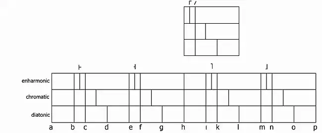 Concerning the diesis Guido of Arezzo wrote about 1026 in his treatise Micrologus that the diesis sharpens the usual tonus between re-mi (a-b; d-e; g-h or h-i) with the proportion 9:8 by a proportion of 7:6 (a-˫; d-˧; g-Γ or h-˥).[7] Guido's explanation, how to find this interval at the monochord, made it already evident that the diesis, taken from the "enharmonic" division of the tetrachord, was used here as a microtonal shift in different melodic modes of the diatonic genus.