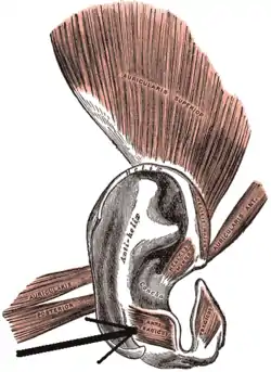 In human anatomy, the antitragicus arises from the outer part of the antitragus, and is inserted into the cauda helicis (or tail of the helix) and antihelix.[1][2]