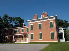 The LeClaire House is a two-story, brick, 14-room Tuscan Italianate mansion on the top of a bluff 125 feet (38 m) above the Mississippi River.[9] The rooms are evenly divided on the two floors.[3] The front square section of the house has four rooms on each floor and there are three rooms in a back wing. A large corridor stretches from the front to the back of the house on both floors. The exterior features a shallow hipped roof, wide, bracketed eaves, and a belvedere on the top of the roof. The house has nine fireplaces, 12-foot (3.7 m) high ceilings, ornate plaster medallions, and a 3-story elliptical staircase. There are also Greek Revival elements to the house as well. They are found in the doorway framed between pilasters and the scroll pediments over the windows. The property originally had a circular drive made of cinders that was lighted with gas lamps. The estate also contained carriage barns, a summer kitchen, an ice house, and a plum grove.[5]