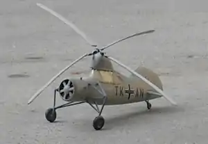 In 1938 Flettner, together with Kurt Hohenemser, built the Flettner Fl 265.[2] The Flettner Fl 265 as the likely pioneering example of a twin-lift rotor synchropter, addressed the problem of torque compensation as the first helicopter with intermeshing rotors (Flettner double rotor).[2]