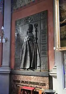 On 1 September 1939, the German invasion of Poland marked the beginning of the Second World War. One of the Nazis' goals was the elimination of Polish intelligentsia. on 28 February 1940, Bishop Nowowiejski and Płock's suffragan bishop Leon Wetmański were arrested by the Germans and imprisoned in Słuck and Działdowo.[1] He refused the chance to escape, saying, "How can a pastor abandon their sheep?"[4] Archbishop Nowowiejski was tortured when he refused to trample on his pectoral cross.[6] Although suffering, he imparted his blessing to the tortured and dying. After three months of torture and hunger, he died, at the age of eighty-three, at the Dzialdowo death camp on 28 May 1941.[4] The place of burial of his body is unknown, but it is supposed that it was a forest in Malinowo.[5]