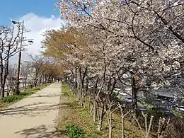 The Anyangcheon Stream Walkway (안양천 산책로) is a walkway located along the Anyangcheon river to Guro, Seoul. It connects several cities and districts in Gyeonggi and Seoul. It is one of the Nine Scenic Views of Guro (구로구경:九老九景) and its cherry blossom trees make it a very popular biking and hiking trail.[1] The Anyangcheon Stream is an educational location where visitors can see various types of plants, fish, and migratory birds.[2]