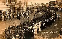 Anzac Day was then, in part, conceived as a solemn memorial day to honour those who had given their lives for the nation and the British Empire. It was hoped that the widespread grieving might be consoled by the public acknowledgment that their loved ones had died in a just and honourable cause. However, the day was designed from the outset to serve many purposes. Its organisational origins lay with the Queensland Recruiting Committee.[8] The inclusion of a military march was specifically designed to promote enlistment and to galvanise the nation's war effort. The notion that 25 April 1915 constituted the "birth of the nation" had been articulated since Empire Day (24 May) speeches in May 1915. By April 1916 that notion of the "birth of the nation" had wide currency.[9] A powerful Anzac mythology was built up around the military prowess of the Australian soldier which accompanied that narrative of national birth.[10] The first Anzac events in Brisbane and elsewhere were a combination of civic requiem, recruiting rally, fund-raising carnival and celebration of nationhood – with different representative phases of the commemoration emphasising those aspects. People thronged the streets in April 1916 to cheer the parading soldiers in such numbers that there were major issues of crowd control on some parts of the march.[2][11]