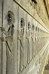 Apadana (Old Persian: 𐎠𐎱𐎭𐎠𐎴) is a large hypostyle hall in Persepolis, Iran. It belongs to the oldest building phase of the city of Persepolis, in the first half of the 6th century BC, as part of the original design by Darius the Great. Its construction was completed by Xerxes I. Modern scholarship "demonstrates the metaphorical nature of the Apadana reliefs as idealised social orders".[1]