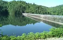 Apalachia Dam is a hydroelectric dam on the Hiwassee River in Cherokee County, in the U.S. state of North Carolina. The dam is the lowermost of three dams on the river owned and operated by the Tennessee Valley Authority, which built the dam in the early 1940s to provide emergency power for aluminum production during World War II. While the dam is in North Carolina, an 8.3-mile (13.4 km) underground conduit carries water from the dam's reservoir to the powerhouse located 12 miles (19 km) downstream across the state line in Polk County, Tennessee.[1] The dam and associated infrastructure were listed on the National Register of Historic Places in 2017.