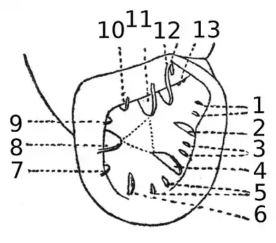 Folds or plicae are named by their position in the aperture, as follows. The numbers refer to those in the diagram shown opposite: