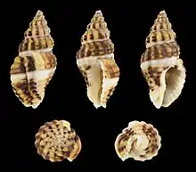 The shell size varies between 10 mm and 20 mm. This shell is quite variable in pattern and shape. Usually it is quite elongated, with strong axial ribs. It shows a brown or yellowish background with paler nodules and one or two suprasutural white bands along the spirals. The interior is white.