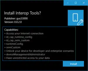 The design for App Installer is similar to the one for the classic Windows Installer, which installs stand-alone MSI files. It shows the app name, the developer, the app's Start menu tile, and a set of capabilities enabled by the app manifest. If the user clicks the Install button at the bottom right corner, the App Installer checks the app's digital certificate. Unlike a standalone installer, App Installer refuses to install an app without a valid digital certificate.[4] If the certificate is valid, the app displays a blue installation progress bar and shows the user a button to launch the app once it is fully installed.