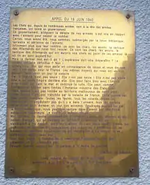 Memorial plate with Appeal of 18 June, Vienne, Isère