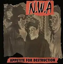 "Appetite for Destruction" is a song by American hip hop group N.W.A. The song is the second single from their final studio album Niggaz4Life. The song also appeared on The Best of N.W.A: The Strength of Street Knowledge. The music video featured members of N.W.A robbing a bank in a 1920s setting. After they rob the bank, the video returns to color and a modern setting. In the last scene, when the other members of N.W.A attempt to get away in a car, Eazy-E blows the car up killing the other members thus ending the song with the line, "Number 10 is my appetite to kill", referencing his version of the 10 Commandments in his verse. An extended version of the song for the music video also appeared on the home video Niggaz4Life: The Only Home Video released in 1992.