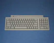 The first keyboard not to be integrated into the CPU case like the Apple II and III series before it. It was designed for and came with the Apple Lisa. Like the Apple III before it, it was intended to be a business computer and included an integrated numeric keypad. Like all Apple computers before it, it came in a beige case to match the CPU and connected by a unique TRS connector. In addition it carried over the use of the "open" Apple key from the Apple III as a command key (though it was represented by the "closed" Apple character) and included a pullout reference guide hidden under the keyboard.