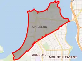 The suburb of Applecross takes its name from the Applecross peninsula in Wester Ross, Highland, on the northwest coast of Scotland. Many of the streets in the suburb have names from the area, including Carron, Gairloch, Ullapool, Kintail, Strome, Ardross, Alness, Kishorn, Glenelg, Duncraig, Dunvegan, Killilan and Roskhill.[2]