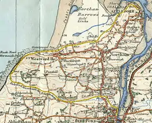 The station was, from 1 May 1908, the terminus of a line running some 7½ miles from Bideford.[4] This line had until 1901 run only as far as Northam.[3] Mr Harold Robert Moody was the station master.[5] The station closed on 28 March 1917 when the locomotives were taken away for use in World War 1.