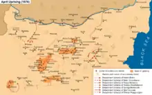 The April Uprising (Bulgarian: Априлско въстание, romanized: Aprilsko vastanie) was an insurrection organised by the Bulgarians in the Ottoman Empire from April to May 1876. The regular Ottoman Army and irregular bashi-bazouk units brutally suppressed the rebels, resulting in a public outcry in Europe, with many famous intellectuals condemning the atrocities—labelled the Bulgarian Horrors or Bulgarian atrocities—by the Ottomans and supporting the oppressed Bulgarian population. This outrage resulted in the re-establishment of Bulgaria in 1878.[2]