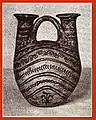 The Messapian school shows far less originality than the other two. When it appears for the first time in the 5th century, the Messapian is already a mixed style, to a great extent Hellenised. Some traces of an earlier geometric tradition still survive, though overlaid and almost stifled by the foreign innovations. In the early 5th century clepsydra, lozenge and band, the old elements of the Italian geometric, are still in existence. But the uncontaminated geometric is very rare in Messapia; the native potter can hardly resist adding his zone of Greek ivy-leaves, a maeander, a rosette, or even a bird. The chief centres of manufacture for such ware (cf. example 4) were at Rugge (Rudiae), near Lecce, and Egnatia, each originally a Rhodian colony. The strongest Greek influence cane therefore from Rhodian sources, though others may have had some share. The hallmark by which all Messapian pottery, except a little of the very earliest, can be detected, is the round disc about the size of a large coin at the stop and bottom of each handle. This peculiarity has caused the nickname of "trozzella" to be given to such forms (cf. example 5 and Gallery).[6] Besides these the only shapes generally employed are the krater with column or handles, the jug, and a simple kind of bowl.