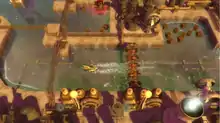 In Aqua, the player commands an elite vessel to navigate a world filled with vast seas and scattered isles. The game world is seen from a bird's eye perspective with the camera tightly following the player's ship. The player navigates the ship with the left analog stick and fires their primary weapons with the right stick.[2] Several types of weaponry can be assigned as the primary weapons, including machine guns. Also at the player's disposal are mines and several types of torpedoes.[2] In addition to various guns, the player can also equip their ships with diverse upgrades. These items enhance different attributes of the player's ship such as weapon damage, ship endurance, speed, and maneuverability. In combination with various guns and upgrades, the player can configure multiple setups to create their own unique play style.[2] The player's vessel is equipped with a special weapon which can be used once the player collects enough Aquaflux; energy collected from destroyed enemies. The player can also employ AI controlled squads of elite watercraft, giving them various context orders to influence the outcome of battles.[2]
