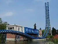 Once riders are loaded, the train then accelerates backwards over a small hill before travelling through a straight section of track. This straight section of track forms the ride's splashdown pool, which is empty at this point in the ride. The car then travels part of the way up a vertical spike of track before travelling forwards over the hill. The car then launches forward into a second vertical spike and comes back down before entering a third backwards launch. While the car is on the vertical spike at the back end of the ride's layout, the splashdown pool fills with water in approximately six seconds. The car then travels down the spike and enters the splashdown pool, which is now filled with water. This serves to slow the car down before the end of the ride to unload riders.