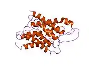 Aquaporins are a family of small integral membrane proteins related to the major intrinsic protein (MIP or AQP0). This gene encodes an aquaporin which functions as both a molecular water channel protein and as a non-selective cation channel gated by cyclic guanosine monophosphate (cGMP).[7] It is a homotetramer with six bilayer spanning domains and N-glycosylation sites. The AQP1 monomer consists of six transmembrane alpha helices that are connected by five loops (A to E).[8] The protein physically resembles channel proteins and is abundant in erythrocytes and renal tubes. The gene encoding this aquaporin is a possible candidate for disorders involving imbalance in ocular fluid movement.[9]
