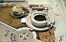 The Aquatarium opened in 1964, with its main attraction being shows featuring trained dolphins, sea lions, and pilot whales.[1] Shows were staged under a 160-foot, golden geodesic dome, which sheltered the audience as they were seated around the world's largest circular marine tank[2] (100 feet in diameter, 25 feet deep, containing 1.244 million gallons of seawater).[3] The Aquatarium shows were billed as "The World's Greatest Marine Show," or "World's Largest Marine Attraction," and starred a dolphin named "Floppy." Floppy was famed for her 25-foot leaps into the air, leading to her characterization as "the world-champion high-jumping dolphin."[4]