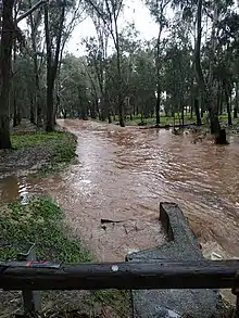 Lateral movement of nutrients and energy from the stream to the surrounding riparian zone and terrestrial environment beyond serve an important role in food webs.[16] Flooding of a stream and the movement of organisms both act to transfer nutrients and energy sources to the terrestrial environment.[20] Algae and fine organic matter washed up from high flows provide resources to herbivorous species and promote plant germination.[17] These lateral movements are limited in how far they make it away from the stream without help, but terrestrial species can increase the distance that these subsidies travel.[20] For example, the emergence of adult aquatic insects from streams is one of the most distinct and well studied forms of aquatic subsidies. They supply 25-100% of the energy or carbon to riparian species such as spiders, bats, birds, and lizards.[21] Emergence of aquatic insects typically peaks in the summer of temperate zones, prompting predators to aggregate and forage along riparian and stream boundaries.[21] These species typically feed near the water's edge but then when they leave to travel elsewhere, their feces will add nutrients to other environments.[20] Another example of a terrestrial species that moves aquatic subsidies further inland is that of the brown bear.[19] Brown bears consume a massive amount of salmon from streams, so much so, they are considered a keystone species.[19] Brown bears have been shown to deliver as much as 84% of the nitrogen found in white spruce trees that are up to 500 meters from the stream on the Kenai Peninsula (Alaska, USA) through their interactions with aquatic subsidies.[19]