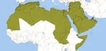 The Arab world, formally the Arab homeland,[21][22][23] also known as the Arab nation or the Arab states,[24] currently consists of the 22 Arab countries: Algeria, Bahrain, Comoros, Djibouti, Egypt, Iraq, Jordan, Kuwait, Lebanon, Libya, Mauritania, Morocco, Oman, Palestine, Qatar, Saudi Arabia, Somalia, Sudan, Syria, Tunisia, United Arab Emirates and Yemen. They occupy an area stretching from the Atlantic Ocean in the west to the Arabian Sea in the east, and from the Mediterranean Sea in the north to the Horn of Africa and the Indian Ocean in the southeast. In 2019, the combined population of the Arab world was estimated at 423 million inhabitants.[25]