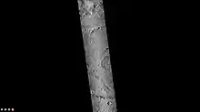 The Mars Reconnaissance Orbiter showed deformation bands in Capen Crater, located in the Arabia quadrangle. Deformation bands are small faults with very small displacements.[31] They often proceed large faults. They develop in porous rocks, like sandstone. They can restrict and/or change the flow of fluids like water and oil. They are common in the Colorado Plateau.[32] Good examples form in the Entrada Sandstone in the San Rafael Swell in Utah.[33] The bands represent failure by localized frictional sliding.[34][35] The bands on Mars are a few meters wide and up to a few kilometers long. They are caused by the compression or stretching of underground layers. Erosion of overlying layers make them visible at the surface. Capen Crater was unnamed before the discovery of deformation bands. It was named for Charles Capen, who studied Mars at JPL's Table Mountain Observatory in California and at Lowell Observatory in Arizona.[36]