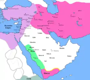 The first mention of Arabs appeared in the mid-9th century BCE, as a tribal people in Eastern and Southern Syria and the northern Arabian Peninsula.[73] The Arabs appear to have been under the vassalage of the Neo-Assyrian Empire (911–612 BCE), as well as the succeeding Neo-Babylonian (626–539 BCE), Achaemenid (539–332 BCE), Seleucid and Parthian empires.[74] The Nabataeans, an Arab people, ruled a Kingdom near Petra in the 3rd century BCE. Arab tribes, most notably the Ghassanids and Lakhmids, began to appear in the Southern Syrian Desert from the mid 3rd century CE onward, during the mid to later stages of the Roman and Sasanian empires.[75]