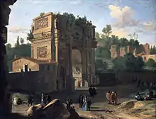During the Middle Ages, the Arch of Constantine was incorporated into one of the family strongholds of ancient Rome, as shown in the painting by Herman van Swanevelt, here. Works of restoration were first carried out in the 18th century,[10][lower-alpha 3] the last excavations have taken place in the late 1990s, just before the Great Jubilee of 2000. The arch served as the finish line for the marathon athletic event for the 1960 Summer Olympics.