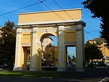 The Arch of San Lazzaro (Italian: Arco di San Lazzaro) is a triumphal arch that stands just outside and east of the city of Parma, Region of Emilia-Romagna. It was constructed in 1628 under the designs of Giovanni Battista Magnani to celebrate the arrival to the city of Margherita de’ Medici, the new wife of the then Duke Odoardo Farnese. At the time of its construction, the panels of the arch were painted by Pomponio Amidano with historical tableaus, depicting