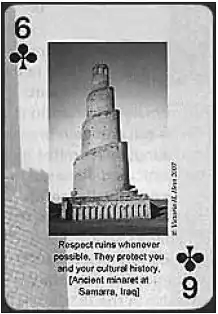 - Six ♣: "Respect ruins wherever possible. They protect you and your cultural history." Samarra Minaret (Malwiya), Iraq.