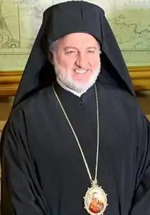 Archbishop Elpidophoros of America (Greek: Ελπιδοφόρος, Greek pronunciation: [e̞l.pi.ðo̞ˈfo̞.ɾ̠o̞s̠]; born Ioannis Lambriniadis (Greek: Ιωάννης Λαμπρυνιάδης); 28 November 1967)[1] is a bishop of the Ecumenical Patriarchate of Constantinople. On 22 June 2019 he became the Archbishop of the Greek Orthodox Archdiocese of America. The official title of Archbishop Elpidophoros: His Eminence Archbishop Elpidophoros (Lambriniadis) of America, Most Honorable Exarch of the Greek Orthodox Archdiocese of America. He is the eighth Archbishop of America elected since the establishment of the Greek Orthodox Archdiocese in 1922.[2]