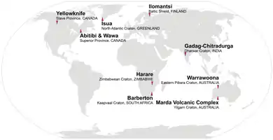 | Onverwacht Group[35] | 3445 ± 3[35] | Barberton | Kaapvaal Craton | South Africa |