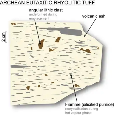 Felsic volcanic rocks also include felsic tuff that was formed when tephra was consolidated.[17] Tuff is composed of volcanic ash, glass shards and lithic fragments.[11][37] Reported eutaxitic tuff from Superior Province, Canada (Figure 3),[37] contains lenticular fiamme. When hot pumice deposits on a cool surface, it is rapidly cooled, recrystallised and welded into quartz with flame-like ending tips.[37] The eutaxitic texture represents a hot vapour-phase emplacement of the fragmented volcanic materials on the Earth's surface.[37]