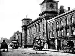 Simultaneously Brown began his ministry in the market town of Bromley, and after a strategic visit from Spurgeon, Brown established the Bromley Baptist Chapel as well as creating a bit of notoriety for himself by making a public lecture that reflected negatively on the Established Church.[5] In 1864, when he was twenty, Brown became pastor of the Stepney Green Tabernacle in the East End of London. When he took charge of a church seating 800, there were only a "handful" of listeners, but by 1867 the crowds attending were so great that one evening even Brown's wife couldn't make her way in. By 1872, the church had put up the East London Tabernacle, an enormous building seating 2,500, "probably the second chapel in London in regard to size" but more resembling prison or a "square brick-built ice-house" than a church. Even so, attendance ran to 3,000 with hundreds unable to gain admission. (Eventually authorities called a halt to shoppers crowding the aisles with their purchases during Saturday night prayer meetings.)[6]