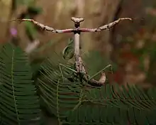 The male stick mantis is smaller than the female and is about 90 mm long and can fly; the female cannot fly and is about 110 mm long. Reproduction occurs when the male injects a single sperm at a time and can last up to half an hour. When mating, the male ejaculates on the female with a miniature penis which is then inserted into a tiny opening at the female's posterior. The male clips its abdomen to the female's egg holding compartment and then the male inserts a single sperm at a time.