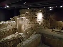 In Barcelona there are hardly any Iberian architectural remains; the main vestiges of this culture were found in the hills of La Rovira, Peira and Putget, as well as in Santa Cruz de Olorde in Tibidabo, but they have not allowed establishing special characteristics with regard to funeral homes or sepulchres. The main remains come from Rovira, where in 1931 vestiges of an Iberian settlement were found that were destroyed when anti-aircraft batteries were installed during the Spanish Civil War. Apparently, it had a wall with two accesses, while located outside the walls there was a set of silos with 44 deposits carved into the rock.[6]