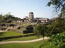 The Maya appear to have founded Lakam Ha about 100 B.C., during the Formative period (2500 B.C. – 300 A.D.),[2] predominantly as a farmers' village favored by the numerous springs and streams nearby. The population of Lakam Ha grew during the Early Classic period (200–600) as it became a full-fledged city; during the Late Classic period (600–900) it was made the capital of the B'akaal (bone) region in Chiapas and Tabasco. The oldest of the structures that have been discovered were built around the year 600.