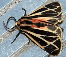 The Arctiinae (formerly called the family Arctiidae) are a large and diverse subfamily of moths with around 11,000 species found all over the world, including 6,000 neotropical species.[1] This subfamily includes the groups commonly known as tiger moths (or tigers), which usually have bright colours, footmen, which are usually much drabber, lichen moths, and wasp moths. Many species have "hairy" caterpillars that are popularly known as woolly bears or woolly worms. The scientific name Arctiinae refers to this hairiness (Gk. αρκτος = a bear). Some species within the Arctiinae have the word "tussock"' in their common names because they have been misidentified as members of the Lymantriinae subfamily based on the characteristics of the larvae.