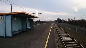 In 1976, the line through the section was duplicated from Sunshine to Deer Park West Junction.[2] The current Ardeer station was opened on 2 May 1977, with an island platform being provided at the Up end of the existing siding, about 800 metres further east than the former station.[1] The Nobel (Australasia) Pty Ltd Siding was renamed ICI Australia Operations Pty Ltd Siding in 1981, before being abolished in 1990.[2]